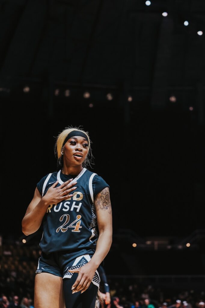 As for the second quarter, both squads combined for the highest scoring quarter of the game with 48 points. Of the Glow’s 26 points in the quarter, Gardner put up nine points as guard Zia Cooke had seven. Washington Mystics forward Alysha Clark scored five of the Rhythm’s 22 points as Charles and guard Shey Peddy of the Fever each had four. At the half, the Rhythm held a 40 – 36 lead.